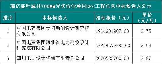 9月27日,叶城瑞亿能新能源有限公司瑞亿能叶城县70万千瓦光伏治沙项目EPC工程总承包中标候选人公示,中国电建集团贵阳勘测设计研究院有限公司以2.75元/瓦位列第一候选人。
