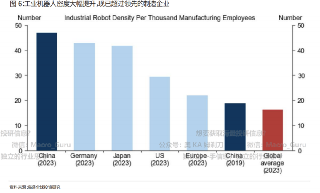 从机器人的使用看,中国的现代化程度其实也非常高。据高盛的数据,中国工业机器人的使用密度在2023年已经超过德国、日本等制造业大国,远高于全球水平。
