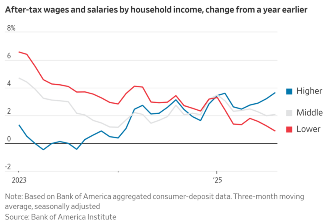 Bank of america institute的数据显示,截至2025年8月,美国高收入家庭的税后薪资同比增速已加速至3.6%,而低收入家庭的增速急剧放缓至仅0.9%,为2016年以来最低。