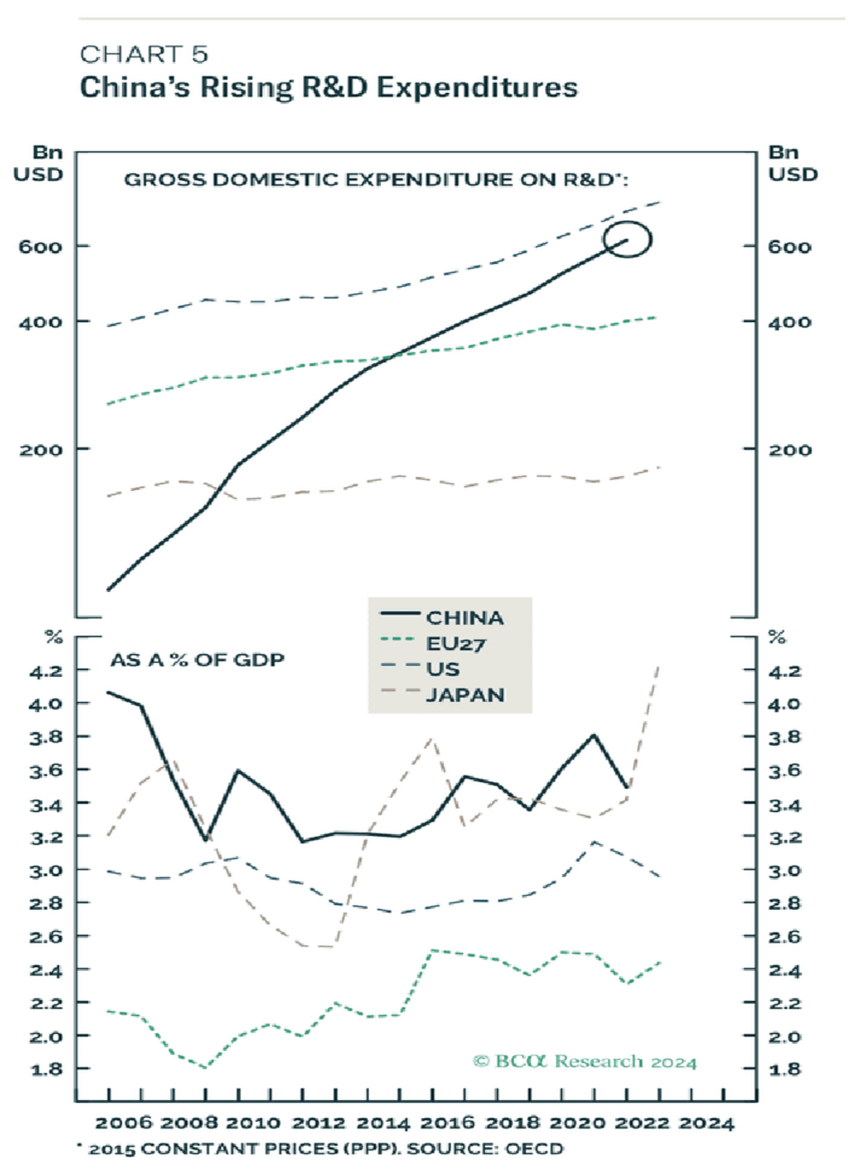 据亚洲经合组织的数据,2024年,中国研发总支出超过6000亿美元,在绝对值上追平了美国。