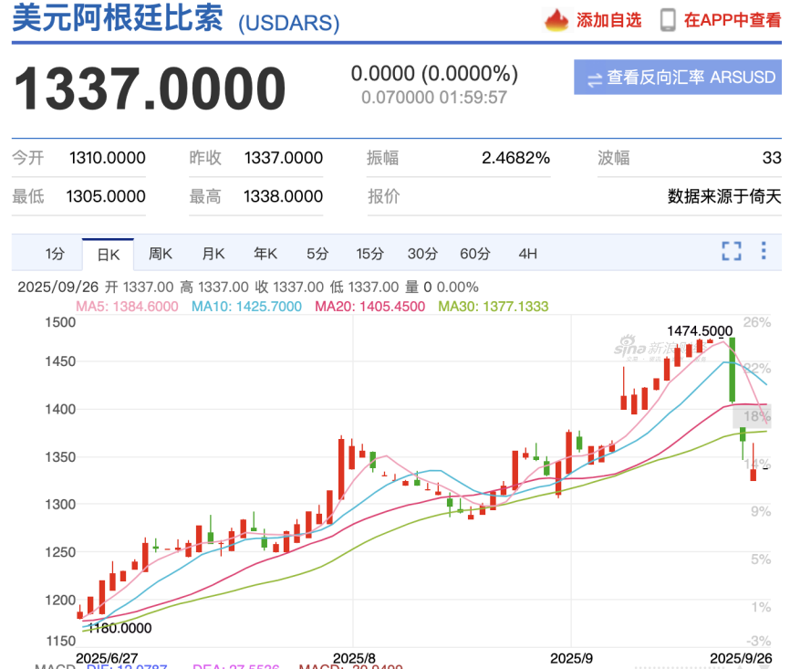 2025年6月份之前,阿根廷比索有几个月的蜜月期,涨涨跌跌,总体围绕在1100到1200(兑美元)徘徊。从6月底开始,比索的走势明显加速,3个月左右时间,上涨接近300点,贬值接近3成。