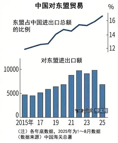 据海关总署的数据,截至2025年8月,中国对东盟进出口占中国进出口总额的17%,保持在高于2024年全年的水平。