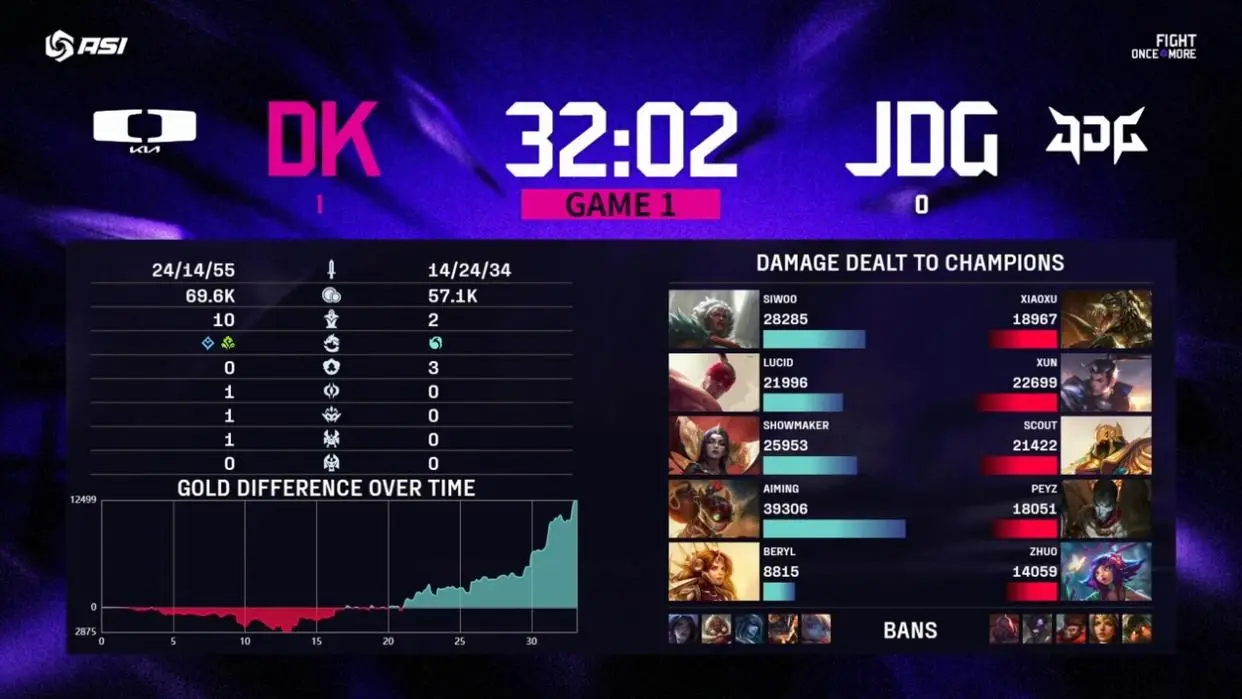 随后Xun接连出现失误,野区被抓阵亡,后入侵野区再次阵亡,连续阵亡之后JDG的局势崩盘,Lucid的盲僧则直接起飞导致局局势逆转,本来没有存在感的ShowMaker妖姬也成功起飞拿下比赛。