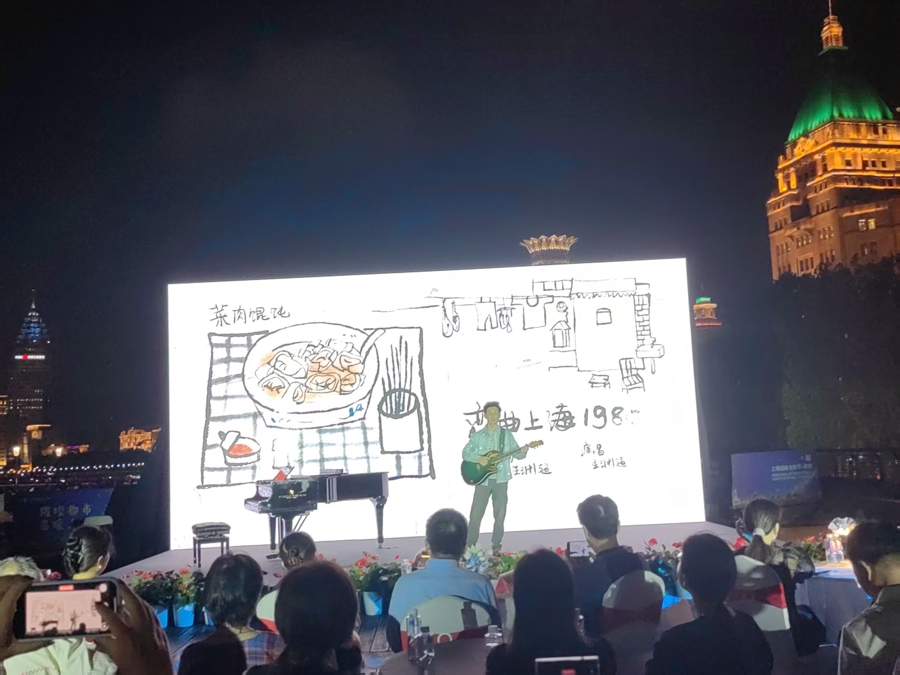 在外滩“情人墙”边,伴着黄浦江边的徐徐晚风,听一听《菜肉馄饨》中老上海的浪漫。10月12日晚,第二期外滩光影艺赏会诗歌朗诵专场在外滩观景平台举办。活动现场,演员周野芒朗读了电影《菜肉馄饨》的原著片段,歌手王渊超带来该片的推广曲《恋曲上海1980》,温情朗读和沪语歌谣揭开这一即将上映的海派电影的精彩一角,也勾起大家记忆中上海的味道。
